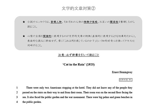 中山講座・入試演習クラスでは通常の論説文に加え、小説やエッセイなどの文学的文章を多く扱います。これは、高い英語力の醸成には文学的な文章に触れることが最適であるという講師の信念に基づいています。通常の論説文では論理展開や背景知識など、英語以外の力を援用して読解することが可能ですが、小説ではそれらを使いづらい。また、文章や段落同士の連関が論説文よりも強固で、俯瞰的な視点を持って読まないと理解できない。これらの特徴により、文学的文章には生徒の英語力をよく伸ばす特徴が備わっていると言えます。